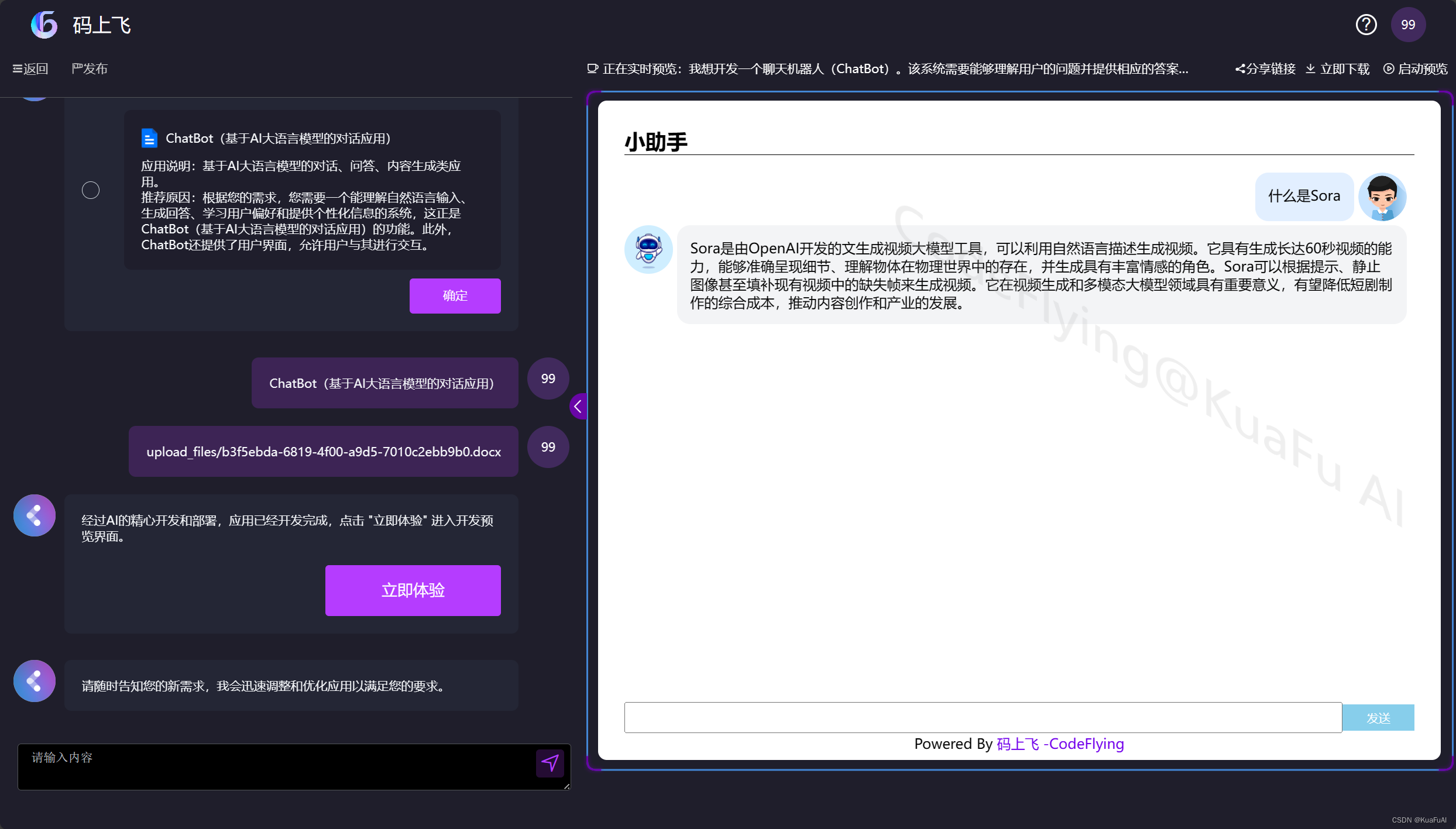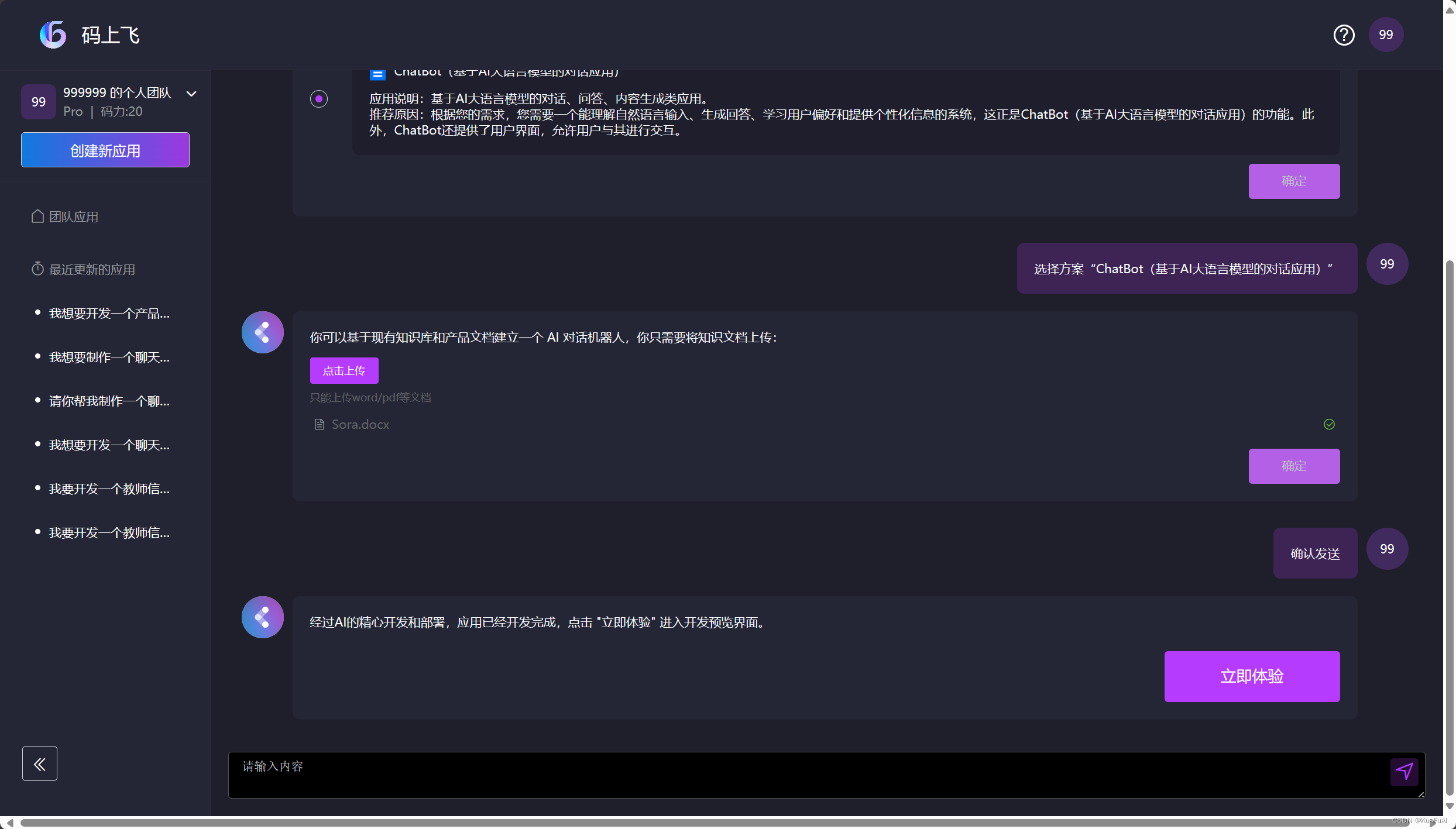 在它解析了文档之后,直接给到我们了一个反馈,显示开发已完成,然后点击立即体验就可以直接去使用了