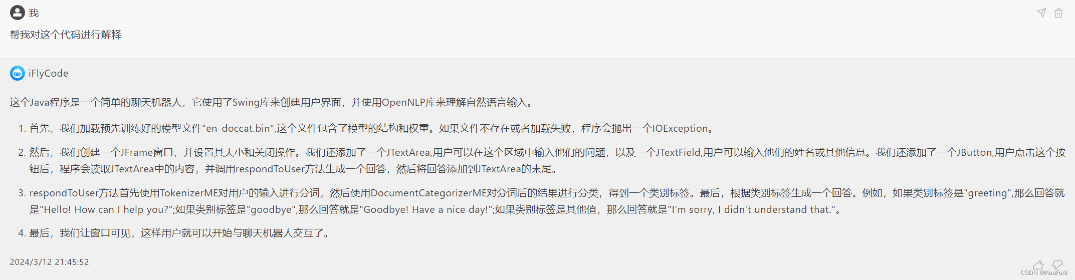 这里我们向他提出了一个新的需求,让他帮我对编写的这段代码进行解释。整个流畅下来不到两分钟,从响应速度上来看,还是非常的迅速的。但是,我们也会发现,它给出的结构和内容还是比较简单的,还只是一个雏形的状态。iFlyCode帮我们设计了一个框架,能够帮助我们更快,更便捷的进行后续的开发,我们也可以在它给的代码基础上,不断的完善,在开发前期为我们节省了不少的时间。