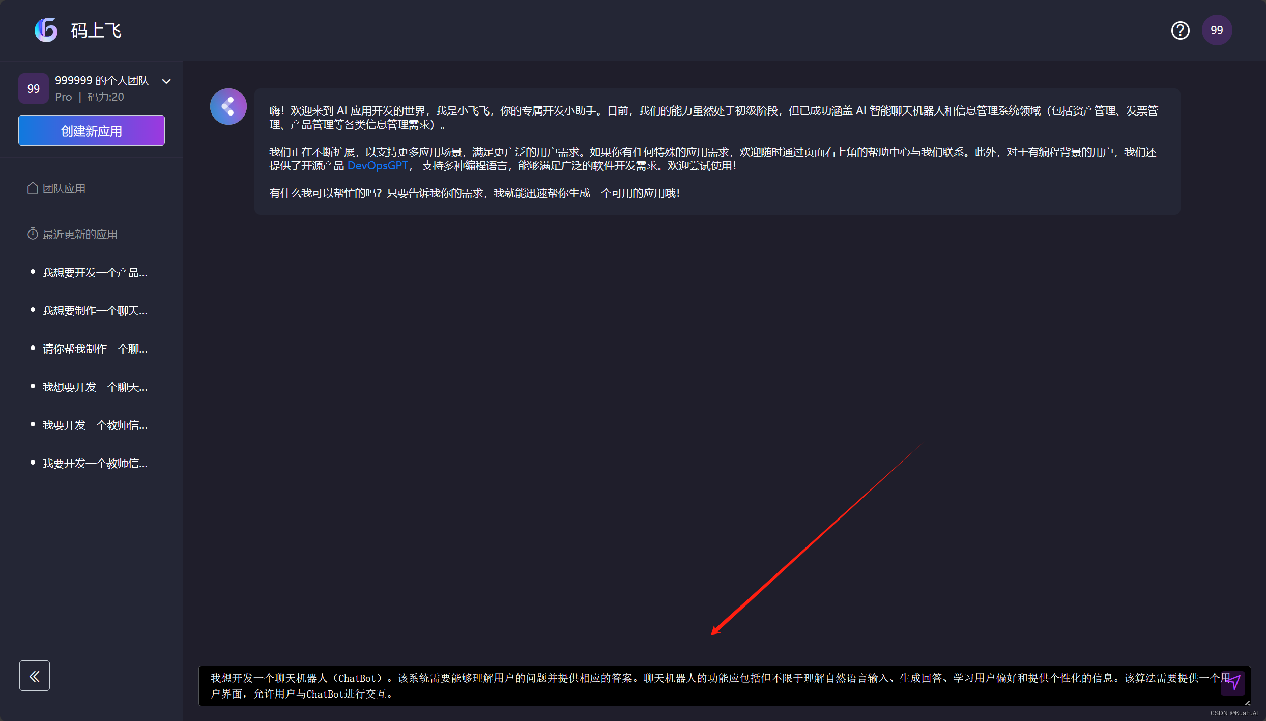 打开CodeFlying,这里我们直接在聊天框内输入我们的需求: